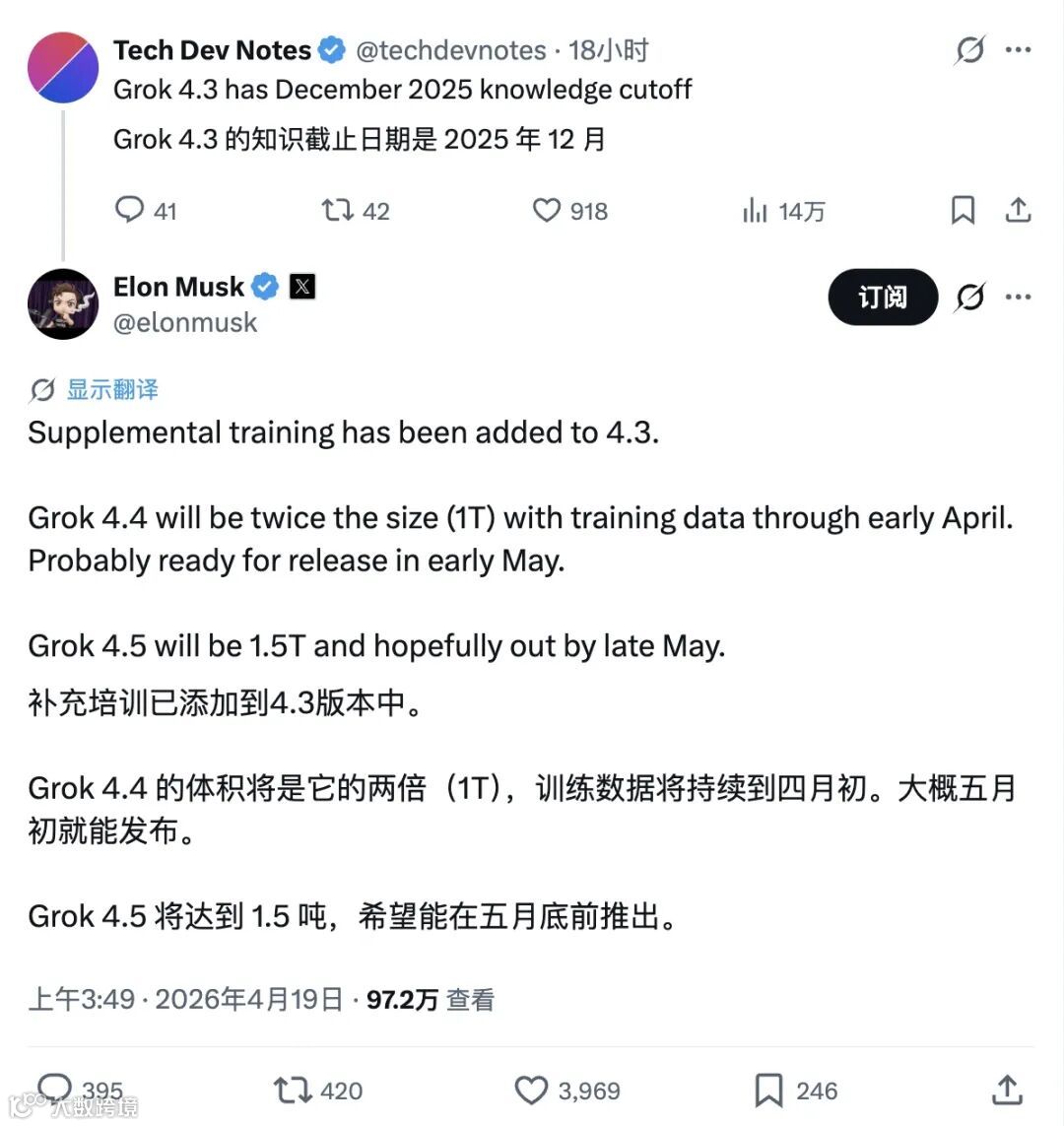 - Grok 4.4预计5月初发布,参数扩展至1T,训练数据覆盖至4月初;