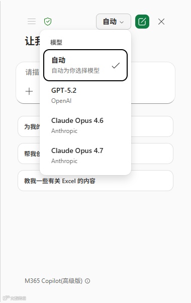 编辑模式下提供多种模型选项,包括GPT-5.2、Claude Opus 4.6/4.7,支持手动切换或启用自动匹配功能。