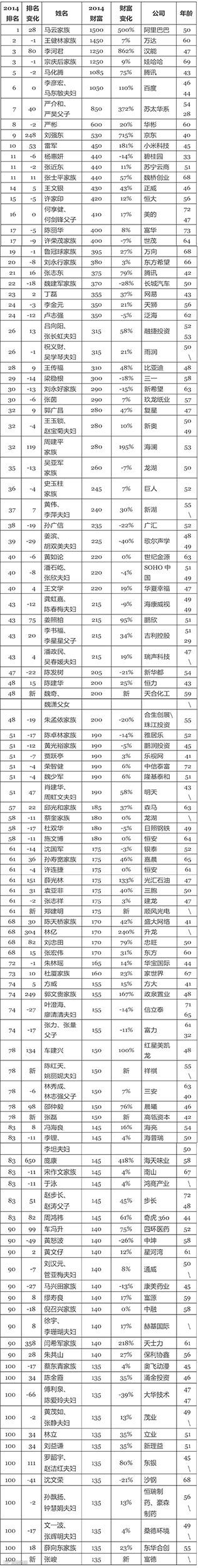 上榜富豪上市公司财富计算的截止日期为2014年8月15日,美元与人民币的兑换比例按照1:6计算,港币与人民币的兑换比例按照1:0.8计算。