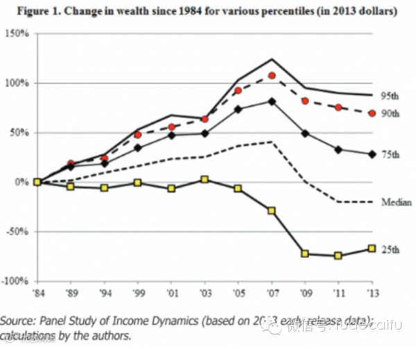 自1984年以来,处于95分位的富裕家庭的财富增长了近100%,虽然金融危机让他们的财富缩水了近三分之一,但总体来说这部分家庭的财富依然有很大幅度的增长。