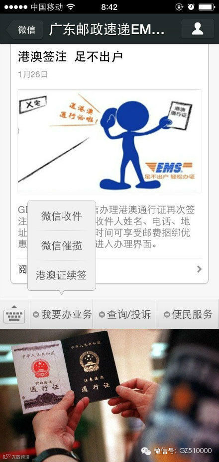街坊们只需关注EMS广东官方微信号(GDEMS11183),就能办理港澳签注。
