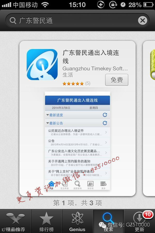 “广东警民通-出入境连线”。省内居民使用(android系统、ios系统)智能手机免费下载安装软件后,即可手机办理各类出入境业务。
