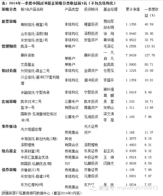 据私募排排网数据中心统计,七大策略中,表现最好的策略为管理期货,据私募排排网研究中心数据,截至2014年3月底,一季度总共有167只管理期货策略私募产品纳入收益统计排名,从产品收益来看,管理期货产品平均收益为8.85%,取得正收益(包括收益率为0)的产品有118只,占比70.66%,4只产品收益超过50%,收益超过20%的产品有32只,收益率超过10%的产品为65只。毛泽红管理的“凯泽一号”一季度收益率高达133.81%,而孙盛云管理的“新博鑫稳健策略1号”则暴亏89.43%,首尾相差高达223.24%。