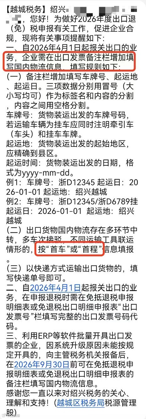 税务部门新规明确:自2026年4月1日起,出口企业须在发票备注栏填写国内物流的首车或首程信息。此举旨在强化出口真实性核验,提升退税合规水平。
