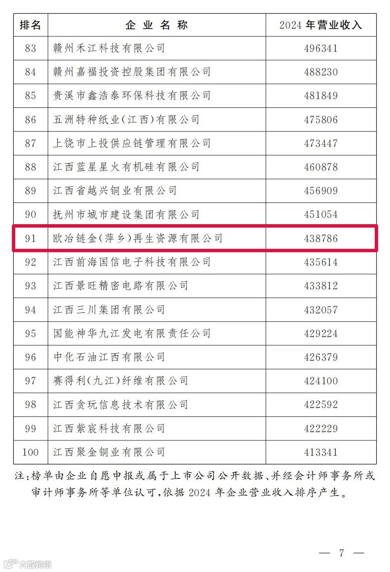 11月21日,省企业联合会、省企业家协会发布“2025江西企业100强”榜单,并首次推出“2025江西制造业企业100强”“2025江西服务业企业60强”“2025江西战略性新兴产业企业60强榜单”等榜单。其中,位于萍乡经开区的欧冶链金(萍乡)再生资源有限公司上榜。