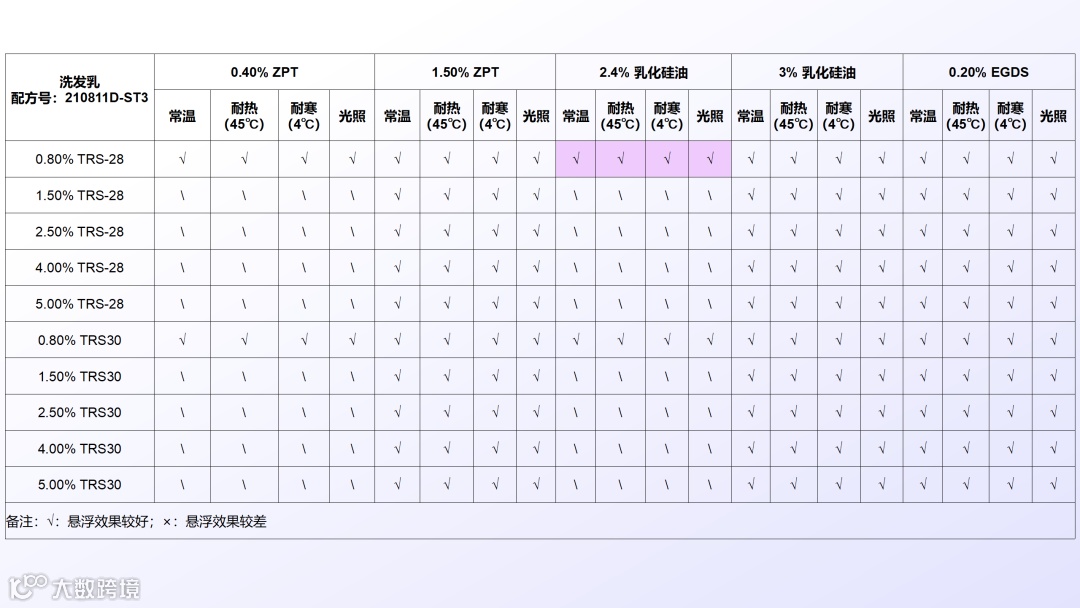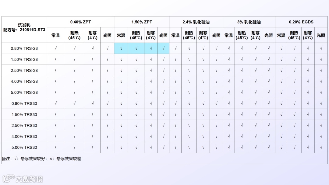 TRS-28 的成功不是靠 “参数碾压”,而是靠 “精准匹配需求”。它以 0.8% 用量悬浮 1% ZPT、2.5% 乳化硅油的优异悬浮力,直击洗护领域去屑、滋润型产品的配方需求;以 “冷配 + 无均质” 的工艺优势,降低生产门槛,缓解生产型企业的能耗焦虑,以 “全链条降本” 的性价比,解决企业的成本压力。