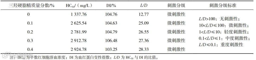 添加0.1%的三羟基硬脂精的样品的HC5为2 625.54 mg/L,L/D值为25.09,其对红细胞的刺激性相比对照组降低。