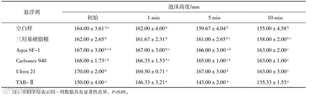 虽然Ultrez 21,Aqua SF-1和Carbomer 940香波的发泡能力比三羟基硬脂精香波发泡能力好,但Ultrez21和Carbomer 940使用时比较麻烦,需要提前浸泡,且储存过程中容易吸潮。