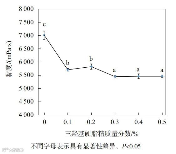采用邓肯公式,对香波的黏度进行显著性差异分析,结果表明三羟基硬脂精的添加量为0.1%时,香波的黏度相比空白样具有显著性差异(P<0.05);当三羟基硬脂精的添加量大于0.3%时,香波的黏度趋于稳定,增加三羟基硬脂精的量对香波的黏度无显著性影响(P>0.05)。