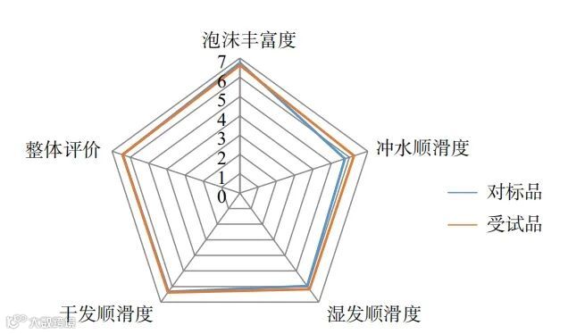 实验研究了三羟基硬脂精对洗发水感官评价的影响,结果如图所示。受试品为添加三羟基硬脂精的洗发水,对标品为不添加三羟基硬脂精的洗发水,结果显示在冲水顺滑度、湿发顺滑度、湿发柔软度、干发顺滑度及整体评价方面,受试品与对标品没有显著性差异(P>0.05)。