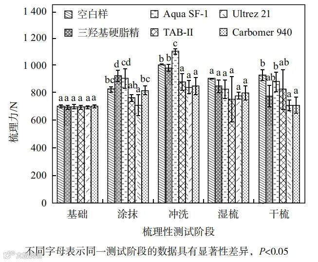 添加三羟基硬脂精的香波在冲洗、湿梳和干梳方面的梳理力均小于空白样香波,且冲洗梳理力小于AquaSF-1悬浮剂,干梳梳理力小于Aqua SF-1和TAB-Ⅱ悬浮剂。