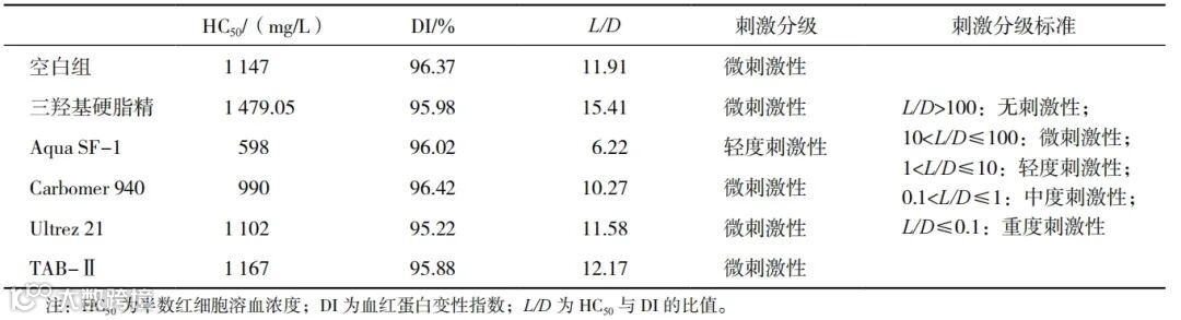 添加三羟基硬脂精的样品,其HC5o为1 479.05 mg/L,L/D值为15.41,其他悬浮剂和空白组的L/D值皆小于15.41,因此可以看出三羟基硬脂精在缓解刺激性略优于其他悬浮剂。