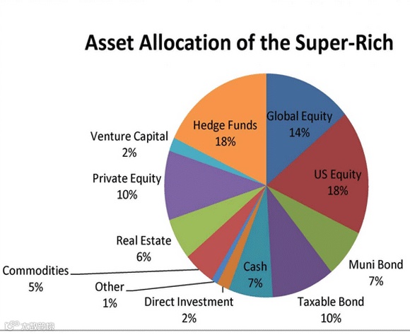 还有,对美国股票、外国股票,或者债券的投资,我们也许可能找到和富豪们的一些共同点,请注意深蓝色和暗红色的扇形区域。