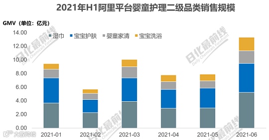 婴童护理产品在阿里平台的2020年GMV超过110亿元,同比达到28%。2021年上半年增速有所放缓,GMV为54亿元+,宝宝护肤与宝宝洗浴依然保持较高的增速。