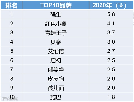 中国婴幼儿与儿童产品市场集中度较低,2020年TOP10品牌占据30.1%的市场份额,TOP品牌整体集中度略降,市场持续吸引新品牌入局。
