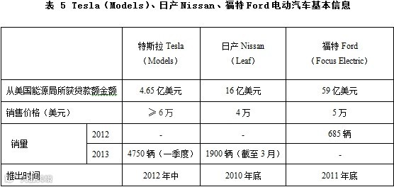 三家公司同为美国能源局扶持公司,给予贷款支持。日产与福特所获贷款数额远高于特斯拉的4.65亿美元。近期,特斯拉更是对外宣布了提前偿还贷款计划。公司称,已收到联邦政府批准,将提前5年完成本应于2022年12月中旬完成的还款。但特斯拉Model S的各项技术数据都大幅领先其他电动车型,得益于特斯拉在Model S上应用的超过250项专利,Model S的全铝车身和最低风阻造型。所以ModelS竞争对手其实并不是其他的电动车而是同价位的豪华车型,销量数据也证实了这一点,截至2013年5月份,出货量超过10000辆,在手订单超过10000辆。超过宝马7系,奔驰S级,奥迪A8和雷克萨斯LS系列位居2013年1季度北美7万美元以上的豪车市场销量第一。