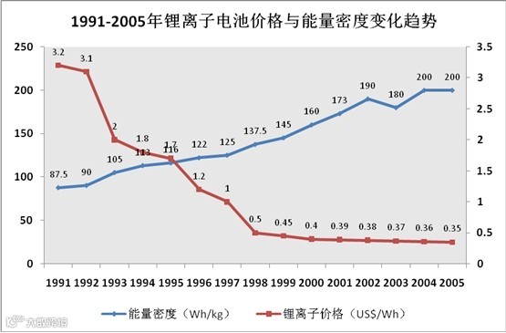 锂电池的出现,让电动车前进了一大步,彻底打败所有其他的新能源车技术路线并且能够有潜力让电动车性能远超汽油车,锂系电池拥有比铅酸电池更高的能量和功率密度。要达到类似内燃车的500公里续航的话,按照每千瓦时行驶5.5公里计算(EPA平均数据),电动车需要存储90千瓦时(度)的电量才能满足。采用整车2吨作为上限,其能量密度最少要达到200wh/kg以上的电池才能勉强符合电动车的要求,从下图可以看出,锂离子电池已经在2005年前后跨越了这一门槛,电动车终于在续航能力方面有了向内燃车正面挑战的资格。