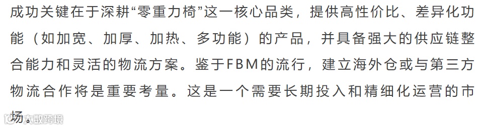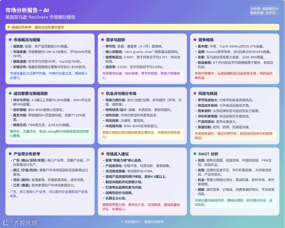 美国亚马逊躺椅市场由零重力椅引领,规模庞大且季节性显著。头部品牌与亚马逊自营份额可观,但市场集中度较低,新品仍有发展空间。FBM模式主导物流,为中国卖家提供差异化运营路径。