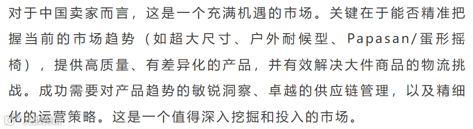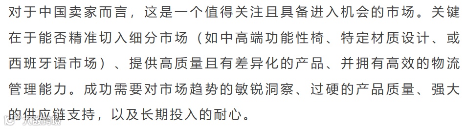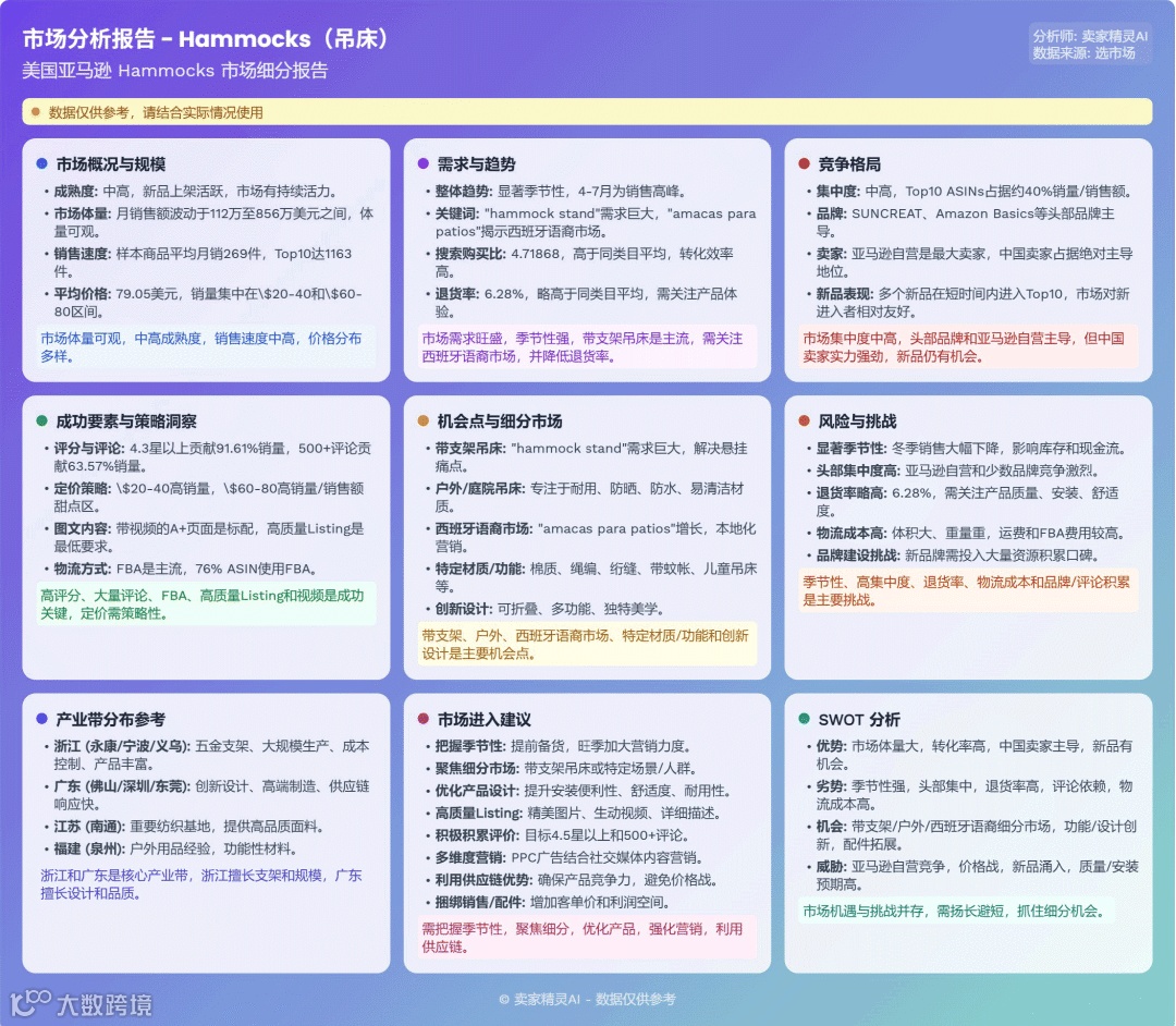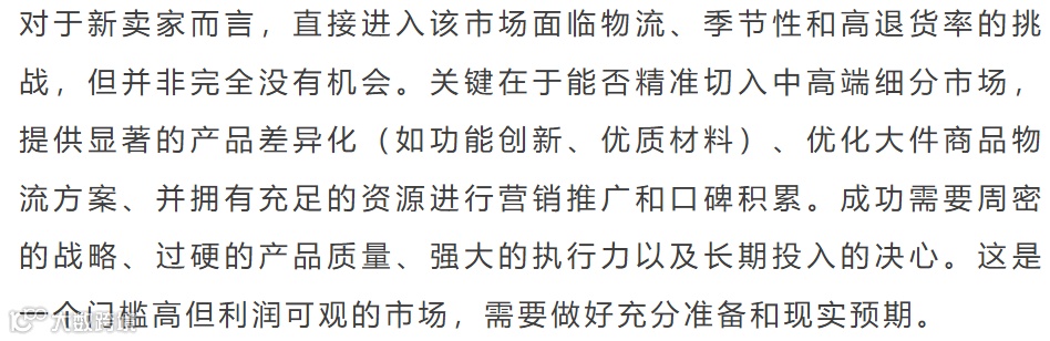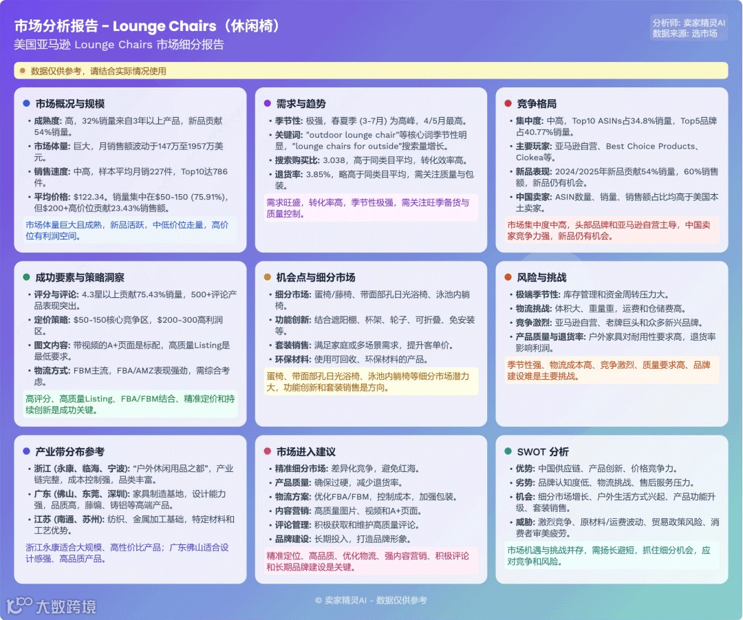 美国亚马逊休闲椅市场体量巨大,季节性极强,品类高度多元化。头部品牌占据主流,但新进入者凭借创新设计与运营仍有机会。中国卖家主导ASIN数量与销量,FBM模式为关键突破口。