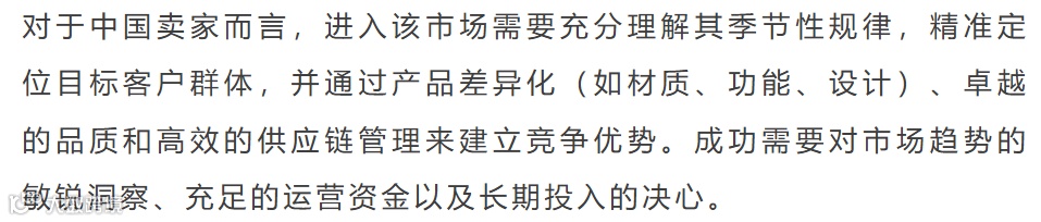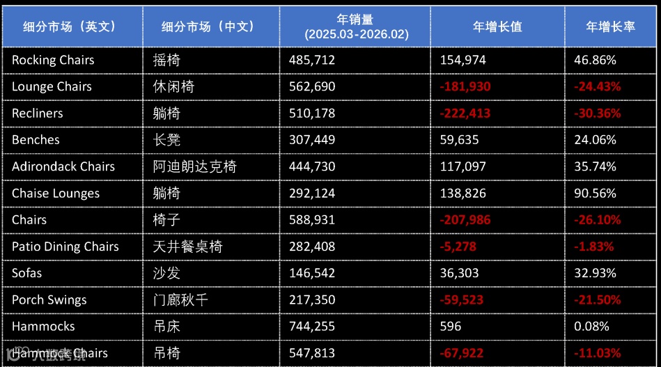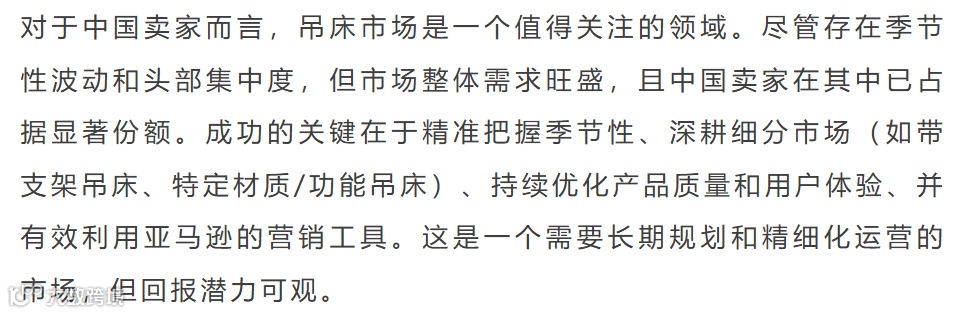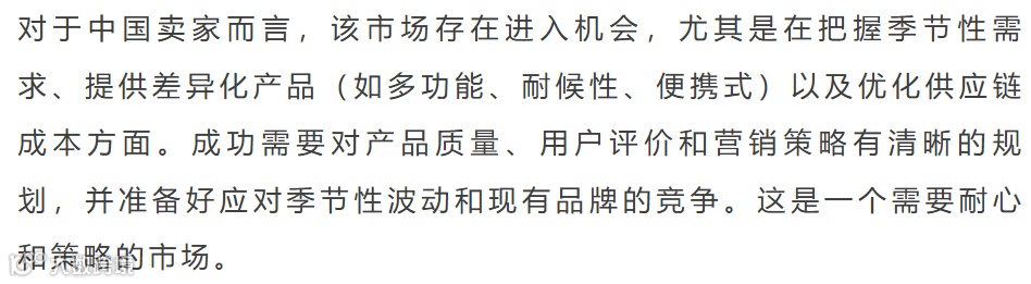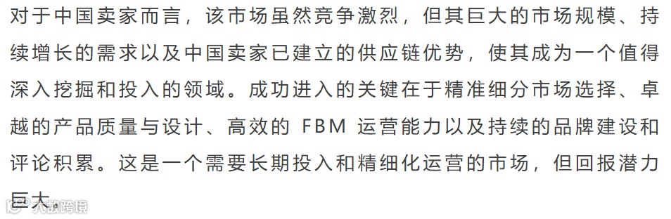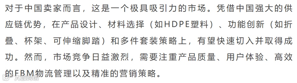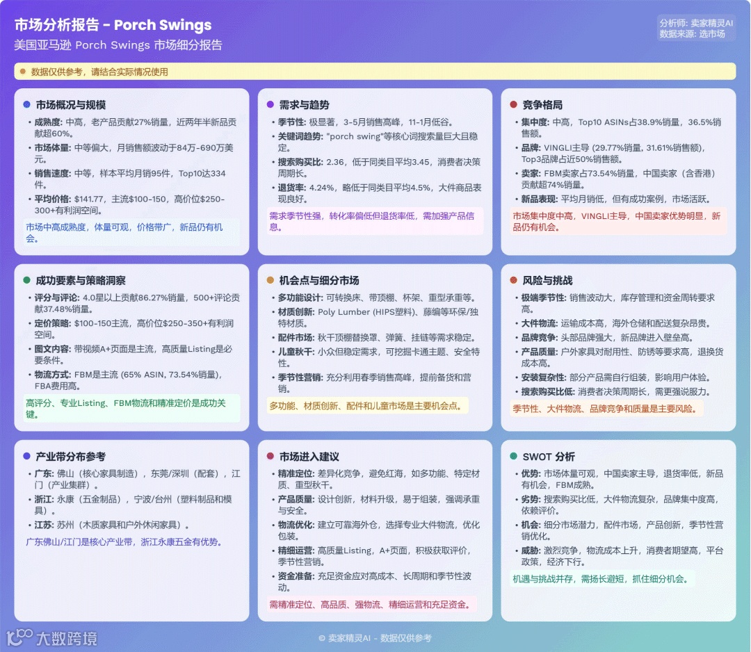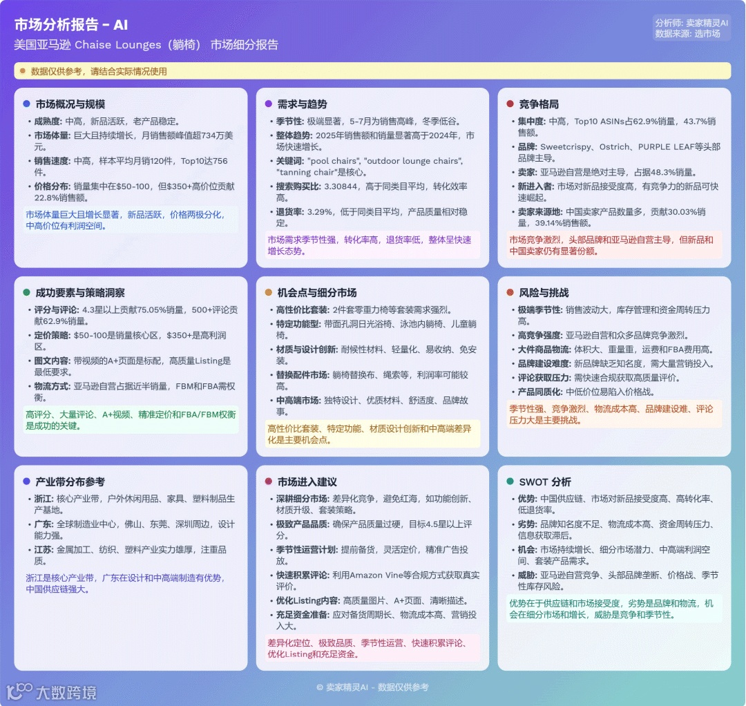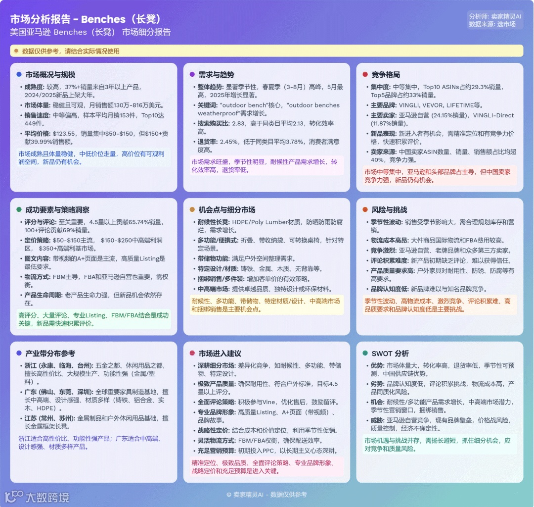 长凳市场季节性突出,竞争激烈。头部品牌集中度适中,新品持续涌入。中国卖家在供应链和FBM发货方面占据绝对优势,是核心增长引擎。