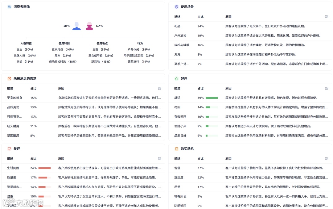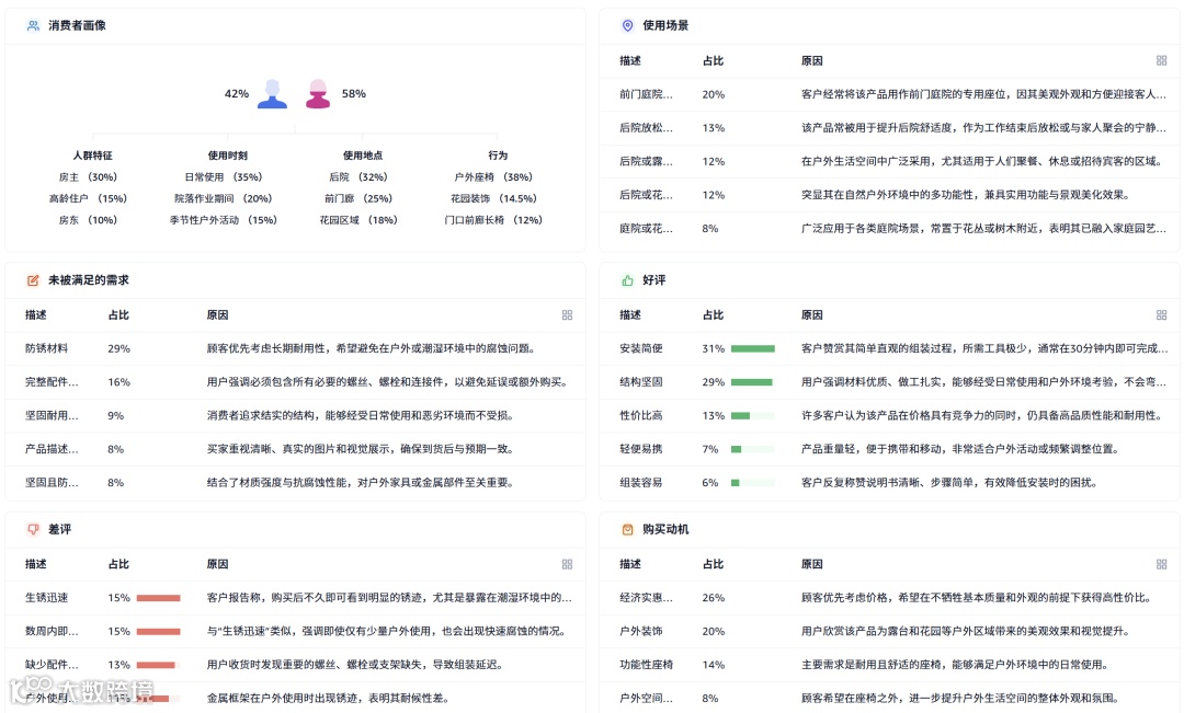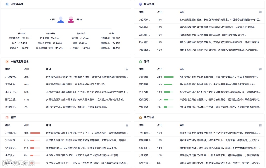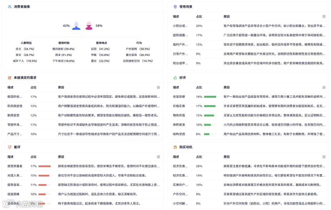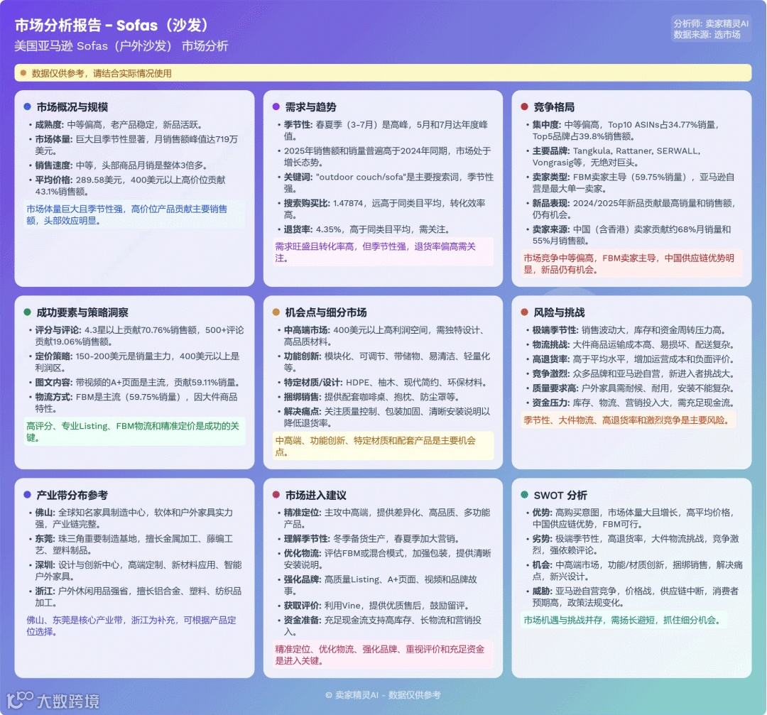 户外沙发市场季节性强,规模大。高价位产品贡献主要销售额,体现高品质需求。中国卖家在ASIN数量与销量上全面主导。