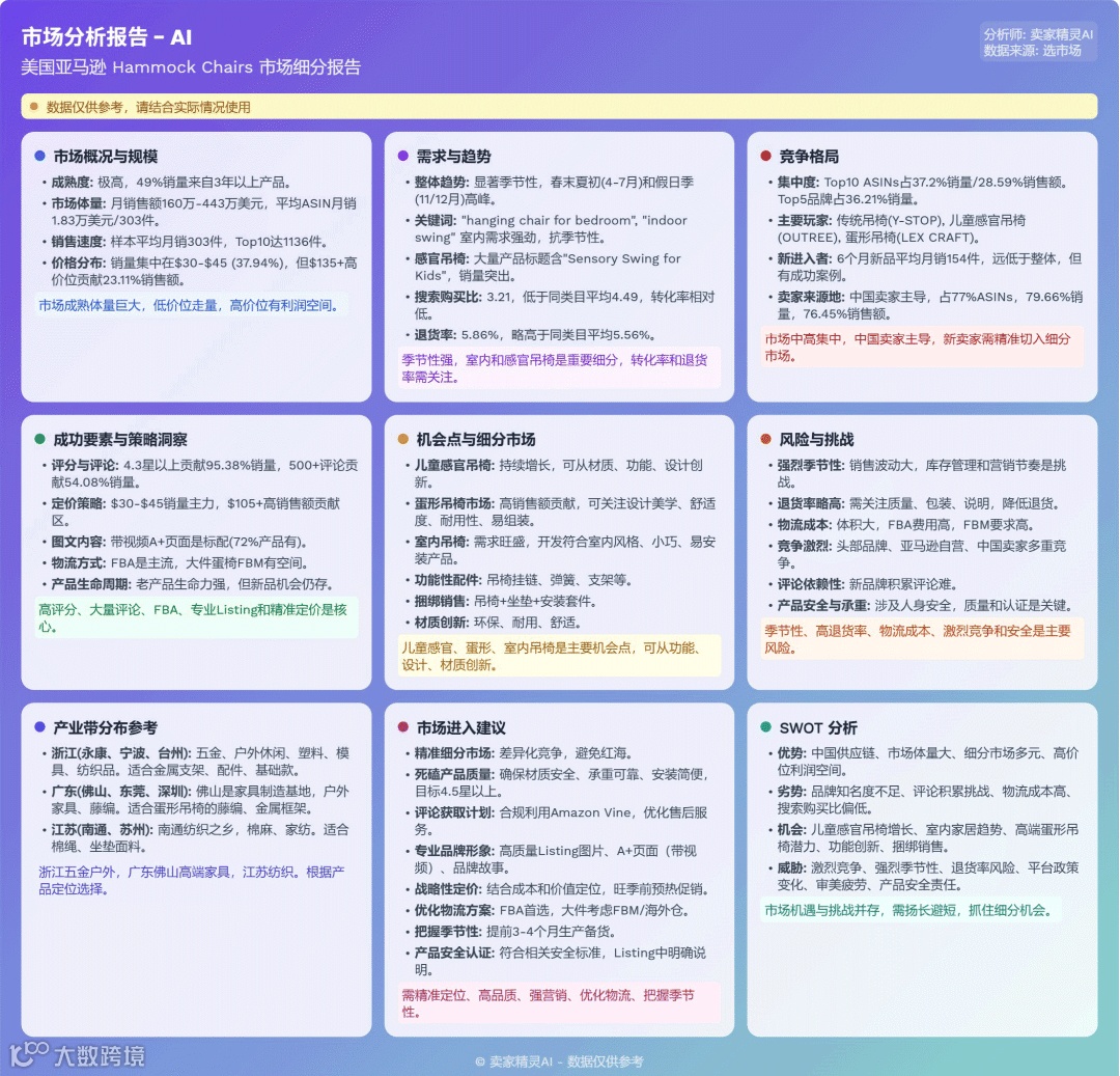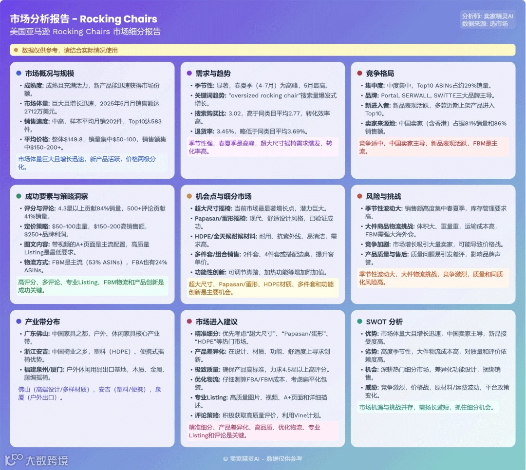 美国亚马逊摇椅市场规模庞大,季节性强,竞争激烈。产品涵盖经济型折叠椅到高端泳池椅,亚马逊自营(Amazon Basics)和Best Choice Products占据主导地位,但新品牌通过差异化仍有成功空间。中国卖家在FBM配送模式中优势显著。