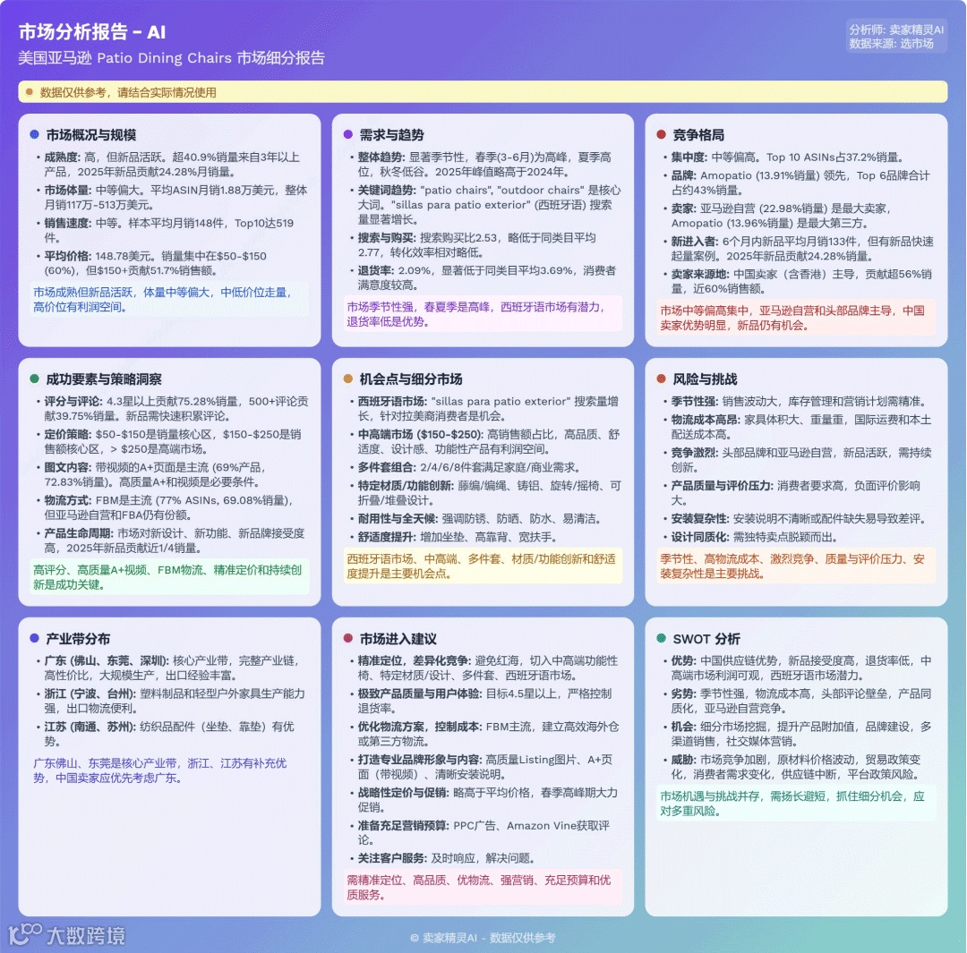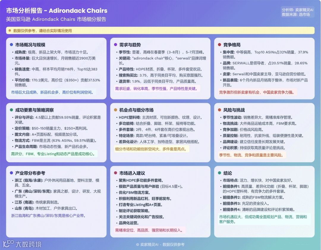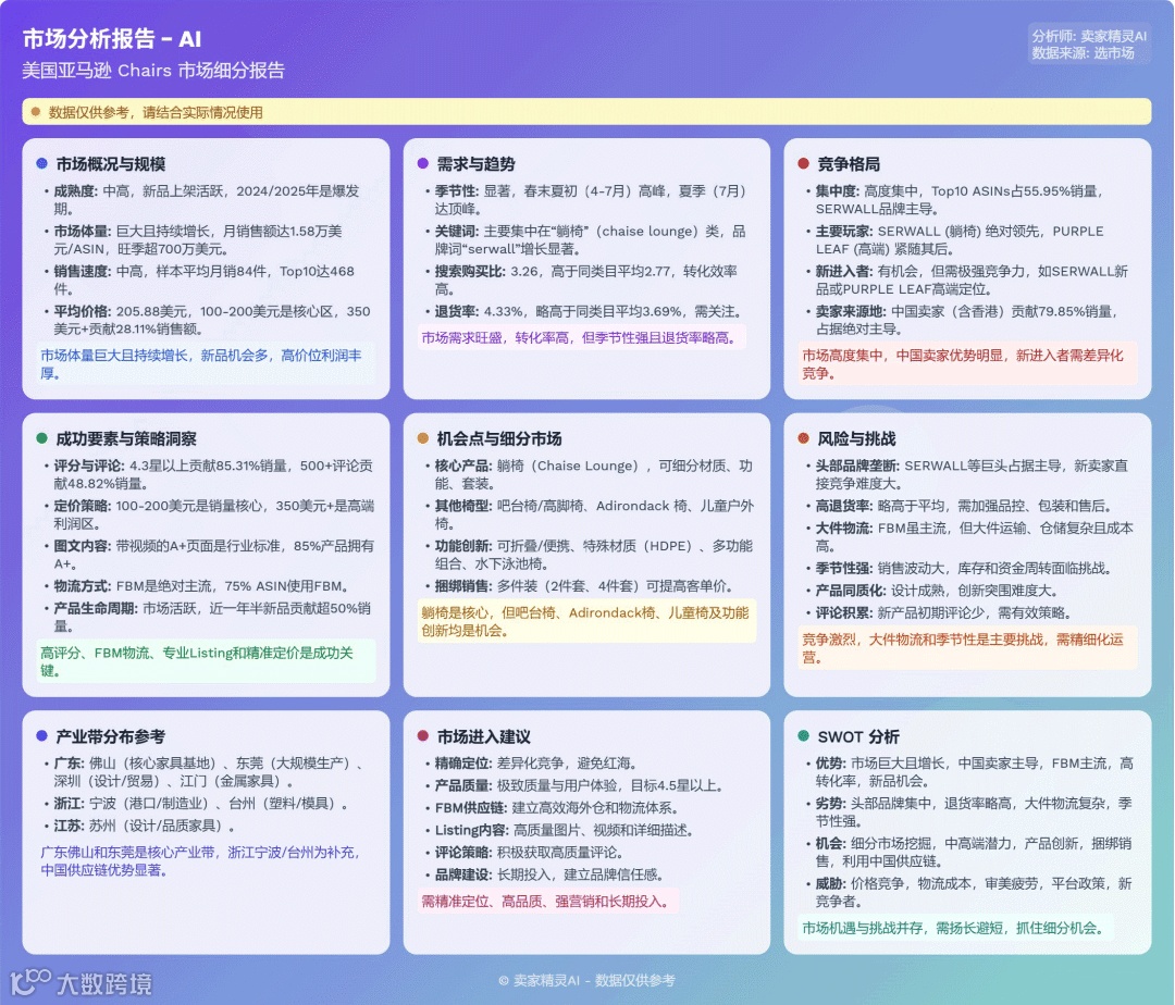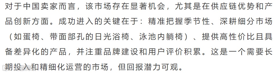 户外椅子市场体量巨大,季节性显著,竞争活跃。SERWALL等头部品牌占优,但新品销量可观。中国卖家凭借供应链与FBM模式占据主导地位。