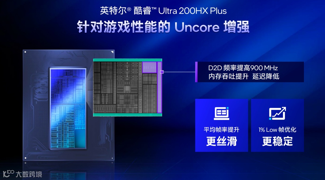 本次升级强化Uncore架构性能,通过提升晶粒间通信频率900MHz至3GHz,突破Arrow Lake多Chiplet架构瓶颈,实现更高平均帧率及更稳定的1% Low帧率表现。