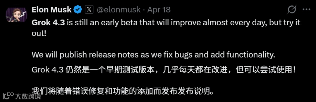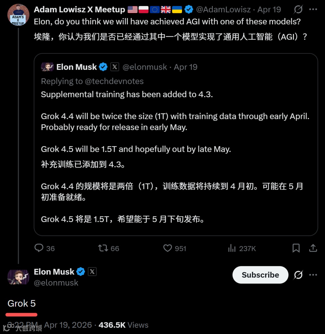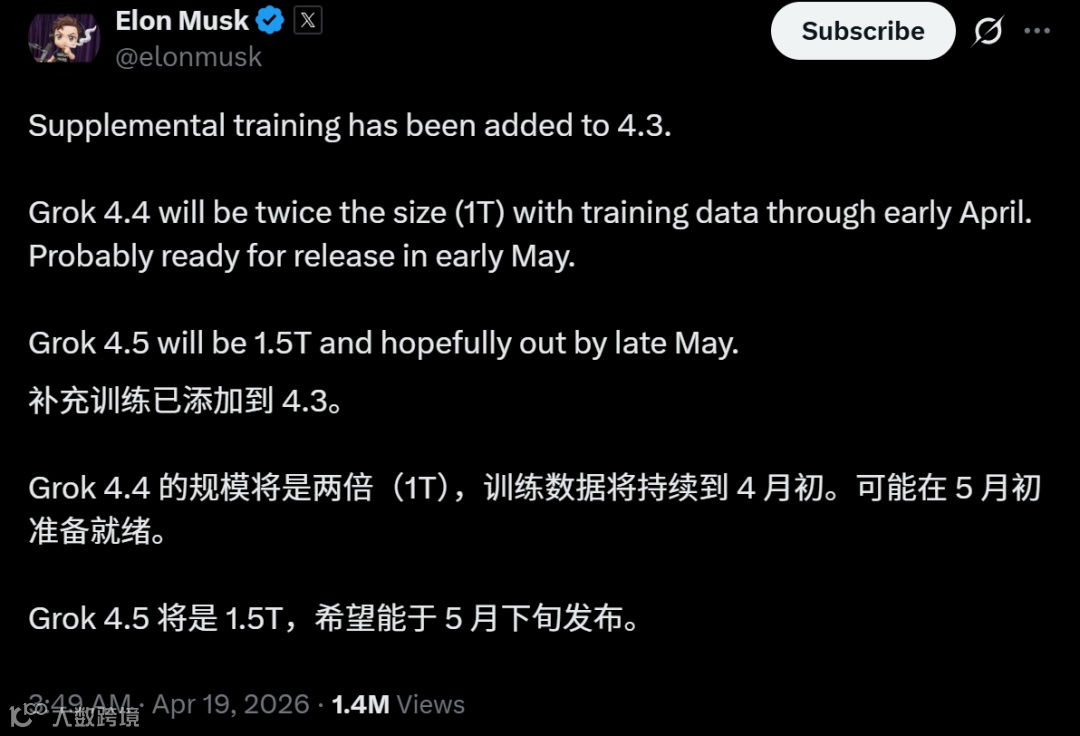 5月初将推出1T参数的Grok 4.4,5月底推出1.5T参数的Grok 4.5。