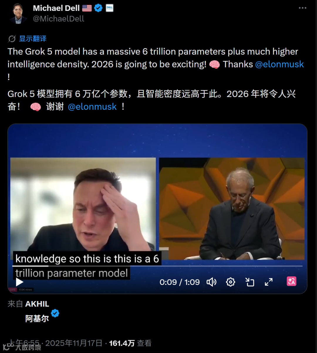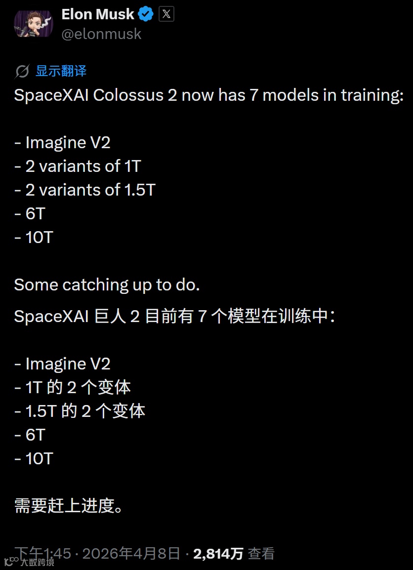 终极目标Grok 5正在Colossus 2超级计算集群上以6万亿参数规模训练。