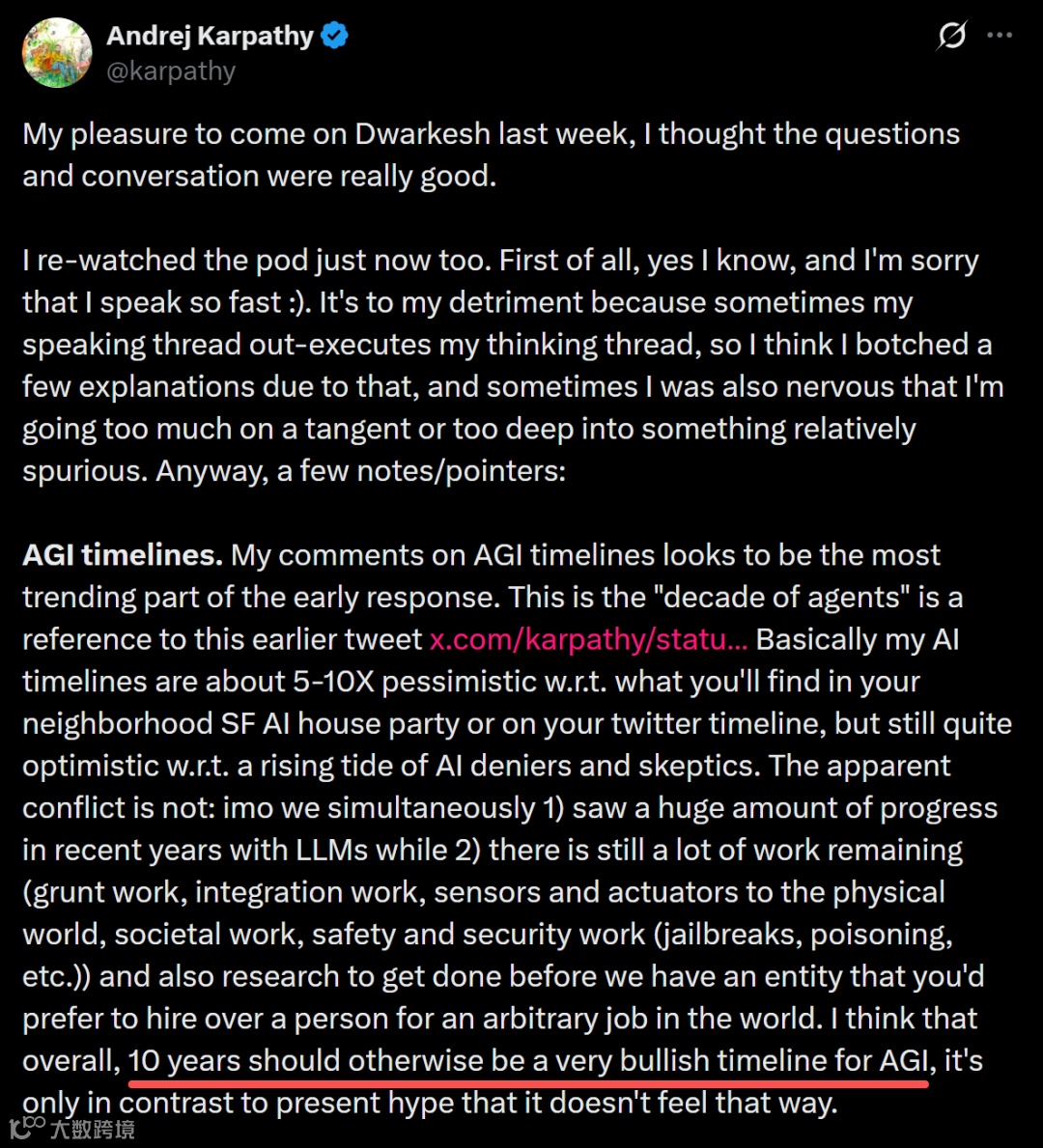 "规模至上主义"虽推动AI进步,但业界质疑参数堆叠难以突破LLM到AGI的根本鸿沟。OpenAI联合创始人Andrej Karpathy认为AGI仍需十年。