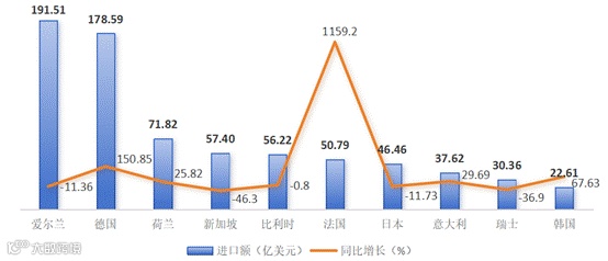 据环球慧思智能贸易终端数据统计(如图19),德国以178.59亿美元的进口规模跃居第二大供应国,并以150.85%的同比增速展现出强烈的扩张态势,正在加速缩小与爱尔兰的差距。相比之下,虽然爱尔兰仍占据最大供应份额,但-11.36%的增长反映出其传统优势正在减弱。与此同时,法国虽然进口额仅为50.79亿美元,但高达1159.2%的爆发式增长使其成为最具潜力的新兴增量极;而新加坡和比利时的同步萎缩,进一步显示出采购重心正从部分传统及亚洲供应地向欧洲大陆核心国家集中的趋势。