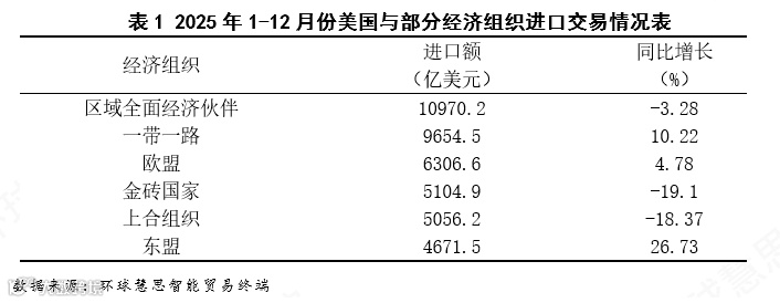 根据2025年1-12月份美国与部分经济组织进口的数据统计(见表1),东盟进口额4671.5亿美元,同比增长26.73%,增速远高于其他所有组织,表明东南亚作为新的制造中心,对美出口替代效应最为强劲。“一带一路"进口额9654.5亿美元,增长10.22%,绝对规模接近万亿美元,增速处于中等水平,显示出除中国外的新兴市场仍保持扩张态势。欧盟增速温和,传统跨大西洋贸易关系相对稳定但缺乏爆发力。