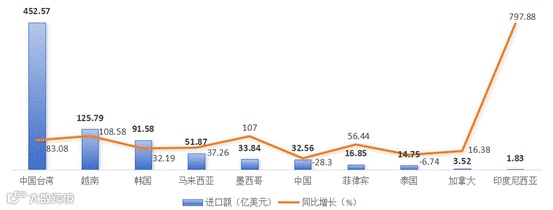 据环球慧思智能贸易终端数据统计(如图16),中国台湾以452.57亿美元的进口额位居首位,同比增长83.08%,稳居第一大来源地。越南进口额125.79亿美元,同比增长108.58%;墨西哥进口额33.84亿美元,同比增长107.00%,两者均实现翻倍式增长,表现抢眼。韩国和马来西亚保持稳健的两位数正增长。而中国进口额32.56亿美元,同比下降28.30%,排名退居墨西哥之后;泰国亦出现小幅下滑。印度尼西亚虽然增速高达797.88%,但因基数较小,进口额仅1.83亿美元,对整体格局影响有限。