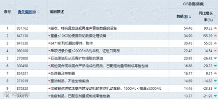 如图8所示,“电机、电气及其零件"与"核反应堆、锅炉、机器、机械器具"两大行业成为进口增长的核心,两者合计进口额达3643.1亿美元,占前十行业总额的55%以上。深度数据显示,这种增长主要由终端消费电子产品驱动,“接收、转换且发送声音等数据的设备"与"便携自动数据处理设备"增速分别高达90.32%和155.39%。这两大单品合计贡献了约893.6亿美元的进口额,是拉动"一带一路"沿线国家整体维持正增长的关键力量。(如图10)
