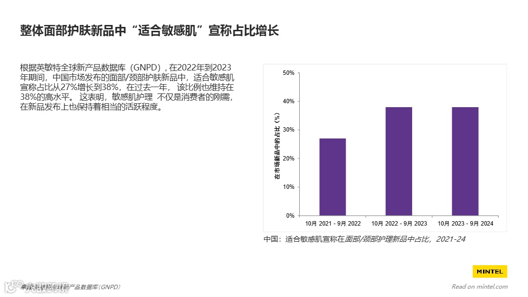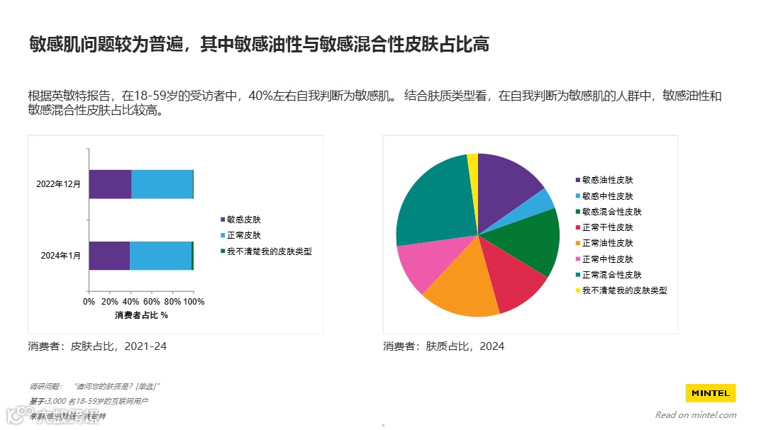 - 敏感肌市场渗透率达40%:中国18-59岁人群中近四成自认敏感肌,其中敏感油性与混合性皮肤为主流,推动“适合敏感肌”宣称新品占比从2022年的27%升至2024年的38%,成为刚性需求。
