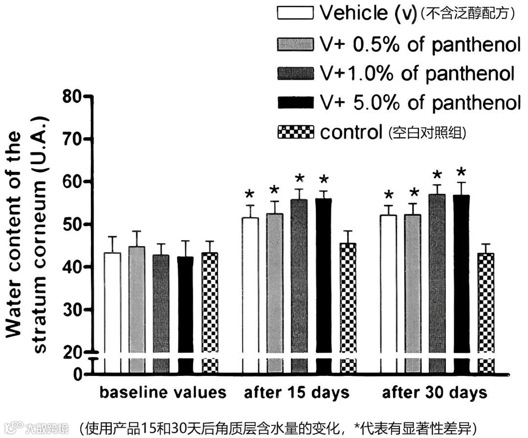 圣保罗大学的研究显示,每天将 0.5%、1.0% 或 5.0% 的泛醇涂在健康受试者的前臂上,在 15 天和 30 天后测试皮肤的含水量和经皮失水量测试结果显示,所有产品都能增加角质层的含水量,其中含有泛醇的配方最为有效。