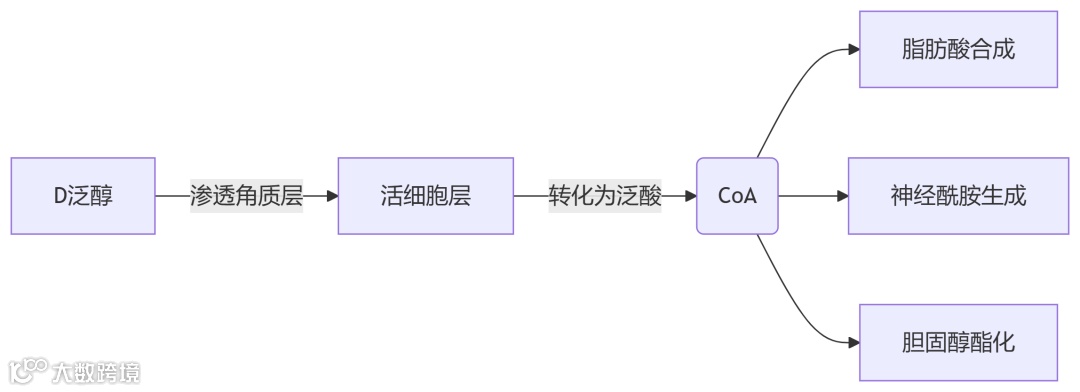 D-泛醇经皮肤吸收后转化为泛酸(维生素B5),参与辅酶A(CoA)合成。辅酶A是细胞能量代谢(如三羧酸循环)和脂质合成的关键辅酶,可促进神经酰胺、透明质酸等天然保湿因子(NMF)的生成。