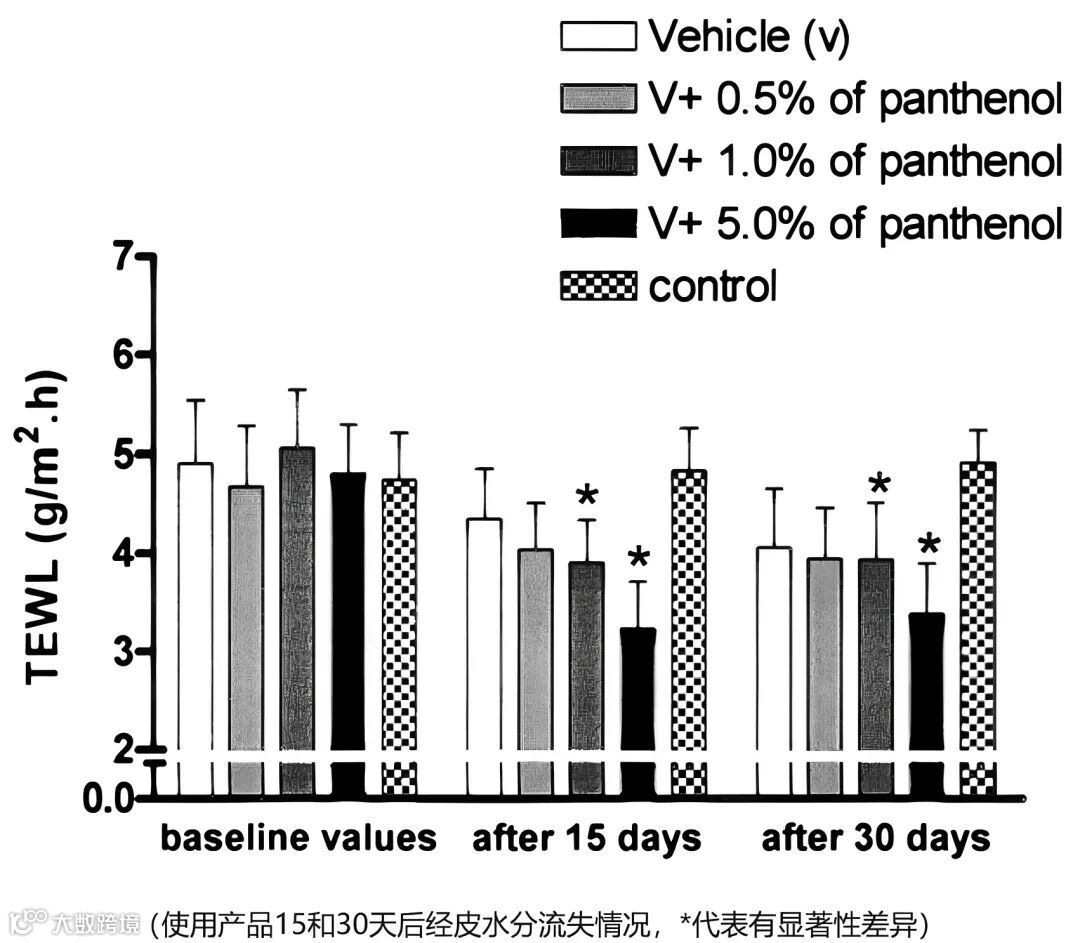 经表皮水分流失(TEWL)测试结果显示,含有1.0%和5.0%泛醇的配方可显着改善皮肤屏障功能。使用15天和30天后,经表皮水分流失(TEWL)显着减少。