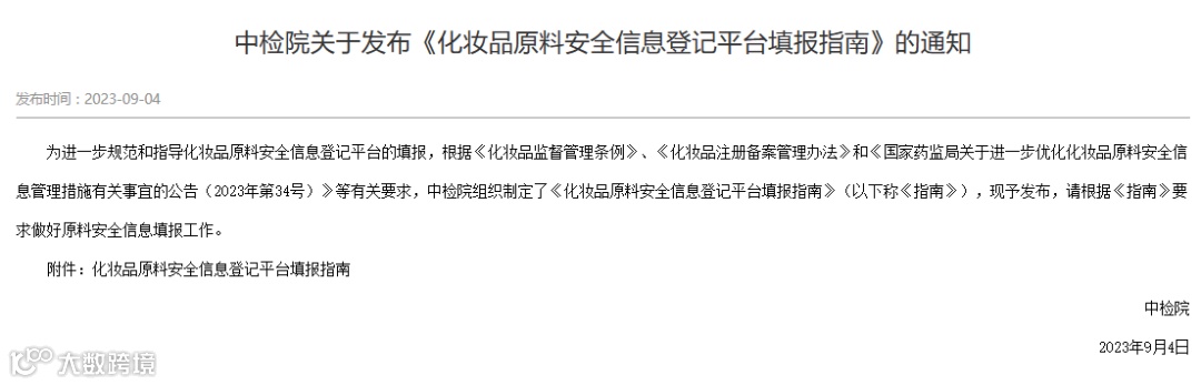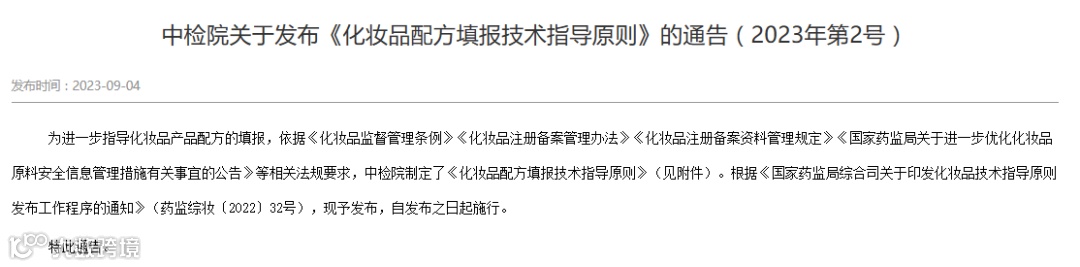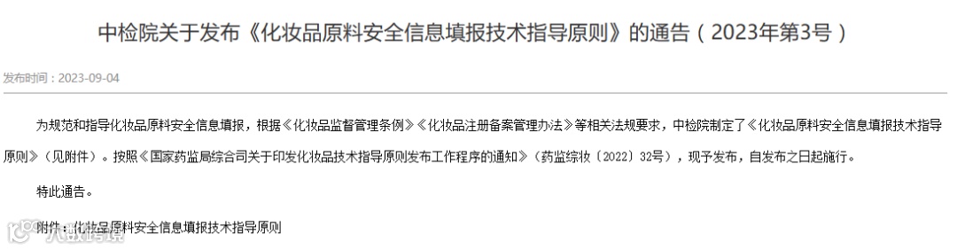 9月4日,中检院接连发布三则通告,分别是《化妆品配方填报技术指导原则》、《化妆品原料安全信息填报技术指导原则》以及《化妆品原料安全信息登记平台填报指南》。