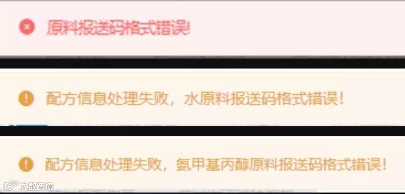 经其测试,如果配方表中含有复配原料报送码的(即首位以“1”开头的报送码)在配方导入或填报时系统会自动报错,提示“报送码格式错误”,而无法进行“下一步”操作。