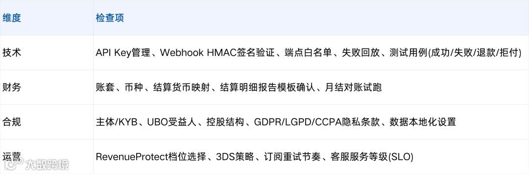 上线清单本地税号、测试用例、退款流程、隐私政策、拒付模板。
