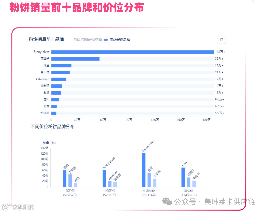 在中国定妆粉饼市场中,国产新锐品牌与国际品牌共同占据主导地位。其中,funny elves品牌凭借其累计超过188万件的销量以及90至100元的产品定价策略,在品牌销量排行榜上独占鳌头。这一卓越成绩的取得,很大程度上得益于网红程十安的强大带货效应。经过程十安的推荐,funny elves的定妆粉饼销量急剧上升,迅速成为市场上的明星产品。