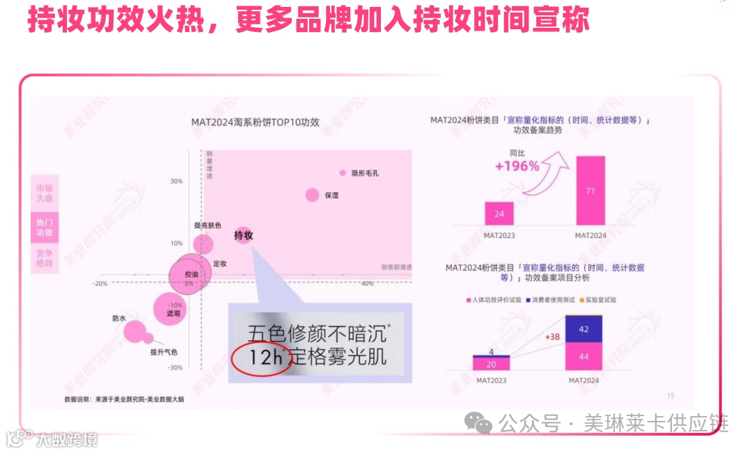 在定妆产品领域,消费者最为关心的两大核心需求是长效持妆与出色控油,这两大需求已成为市场研发的重中之重。为响应这些需求,各大品牌纷纷加大力度投入到持妆控油技术的研发与创新中。当前,量化持妆效果已成为一种主流的营销方式,众多品牌在产品宣传中积极引入时间宣称策略。