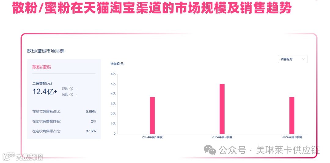 截至2024年的前三季度,定妆散粉在天猫淘宝渠道的销量表现十分亮眼,总销售额达到12.4亿,销量在定妆品类中占据了38.89%的市场份额,销售额占比为37.6%。这一数据反映了定妆散粉在市场上的受欢迎程度和其在定妆品类中的重要地位。