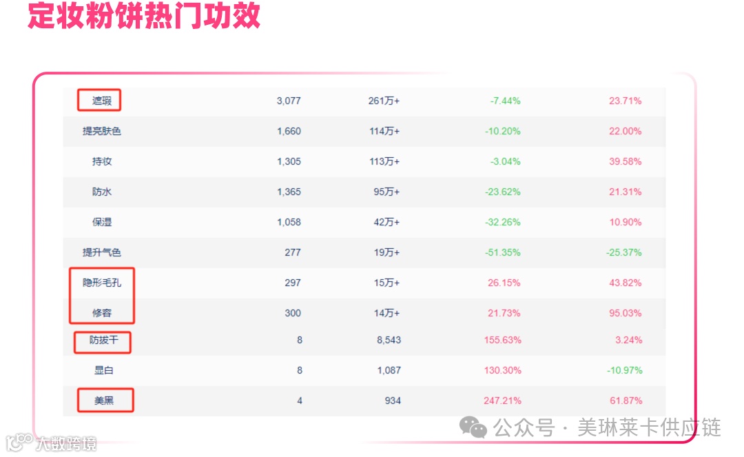 而在热门功效上,除了基本的定妆和控油需求外,消费者越来越关注粉饼的遮瑕力、隐匿毛孔、修容、防拔干,甚至是美黑等进阶功效。这一趋势表明,消费者不仅期望粉饼能够辅助打造精致底妆,还追求在使用过程中获得更加细致和全面的肤感体验。这种对多功能性粉饼的需求上升,反映了消费者对于定妆产品更高层次的要求。
