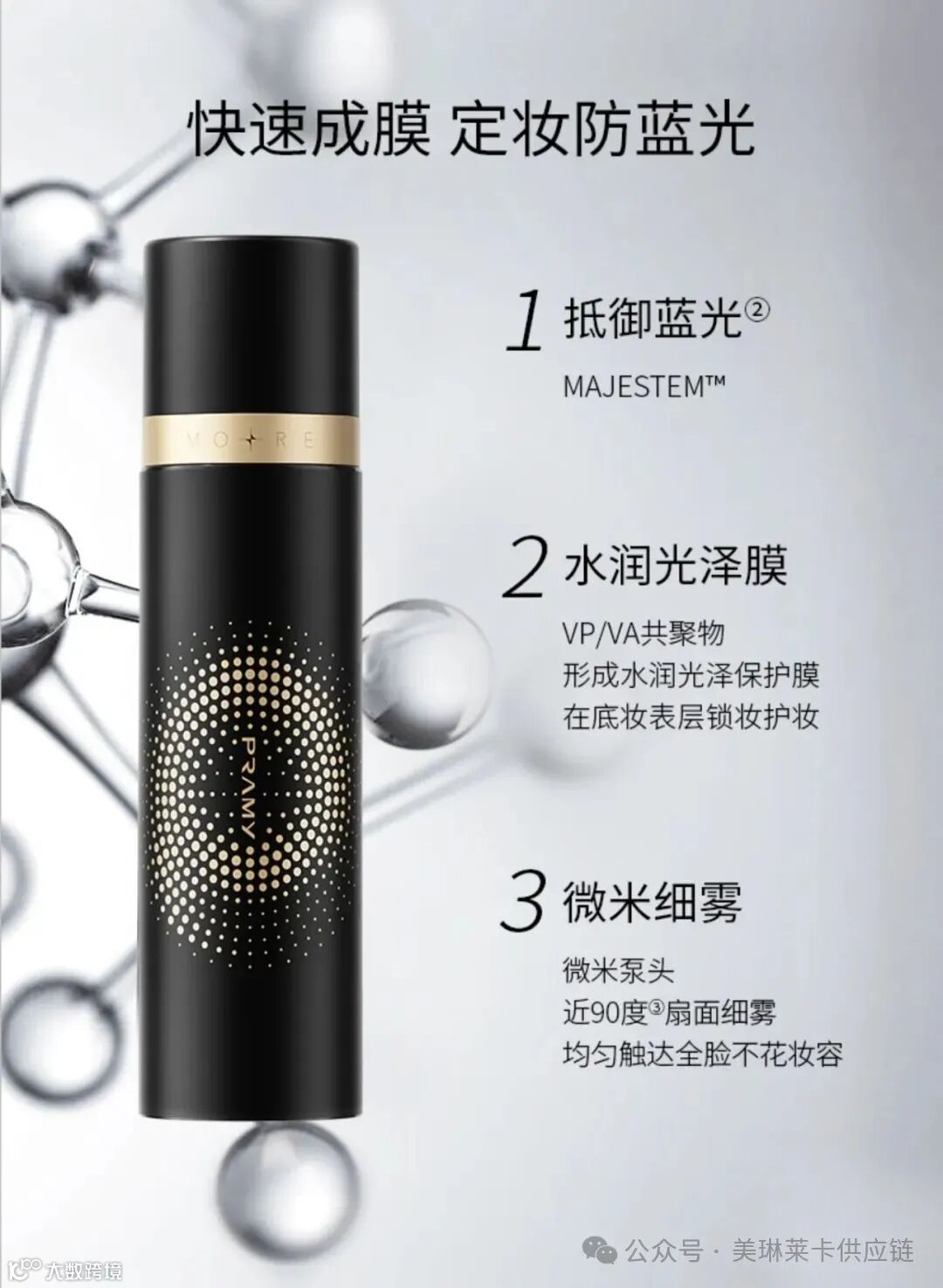 柏瑞美的保湿定妆喷雾,以其自研成膜剂Pra-Membtech®和四重UV防护技术为核心卖点,不仅提供了清透的定妆效果,还实现了隐形的防晒保护,满足了消费者对于防蓝光和定妆的二合一效果的需求。