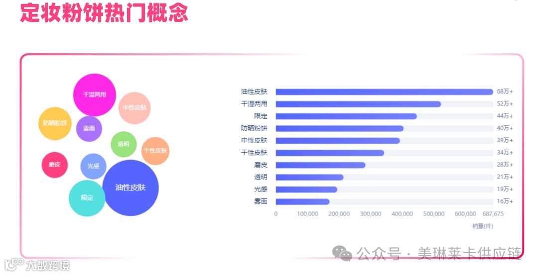 而在热门概念的分布上,“油性肌肤”的定妆需求在市场上占据了领先地位,这表明油性肌肤的消费者对于能够有效控油和定妆的产品有着强烈的需求。而干湿两用和限定概念的产品也在热销榜上名列前茅,这反映了消费者对于产品多功能性和独特性的追求。