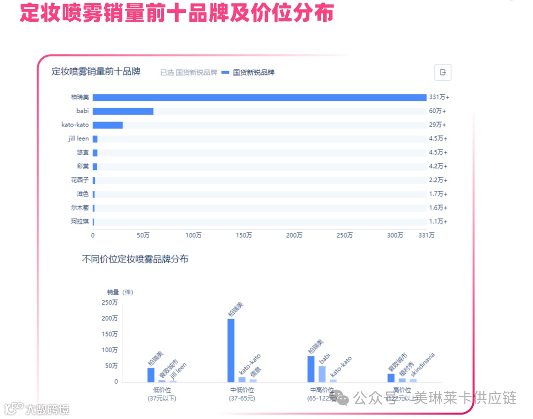 在这一市场中,国产新锐品牌表现突出,主导了定妆喷雾市场。柏瑞美以331万以上的销量和65~122元的中高定价策略,成为了该品类的销量榜一。