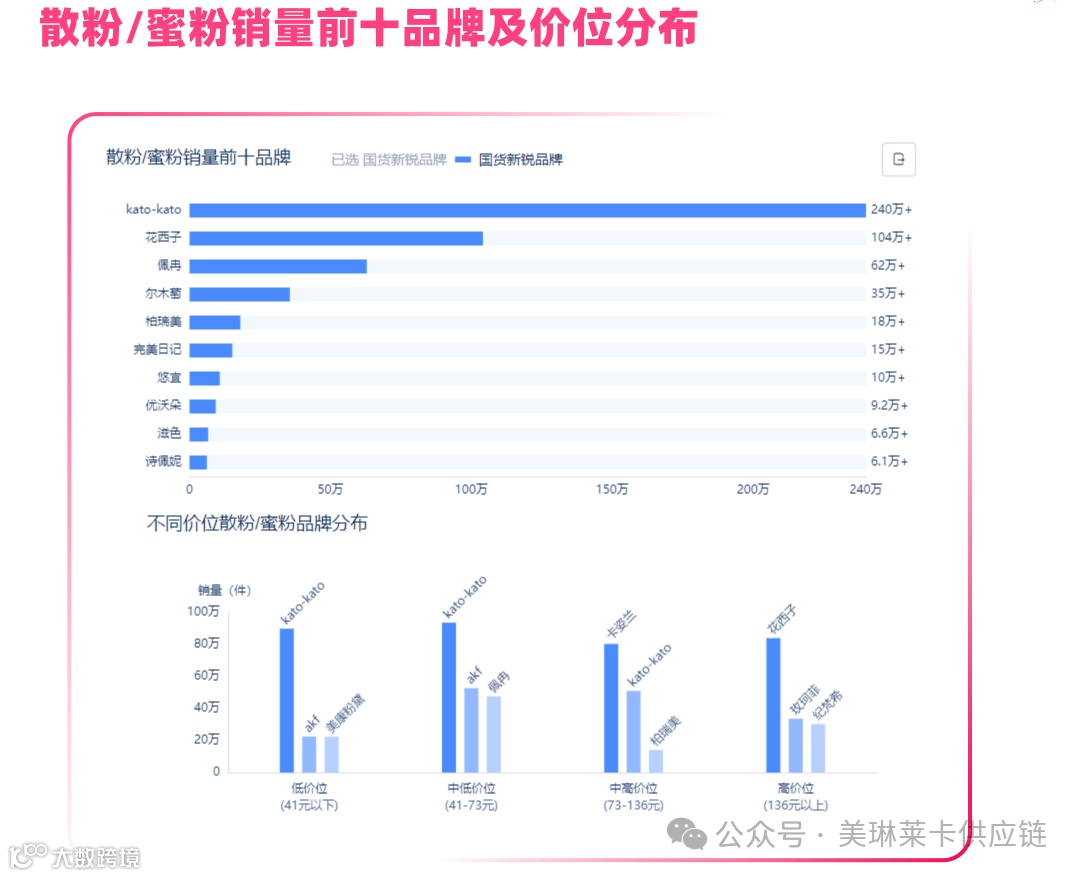 在品牌分布上,国货新锐品牌在定妆散粉市场中占据了主导地位。其中,KATO-KATO以240万+的销量和73~136元的中高价位,成为了品牌销量榜的领头羊。